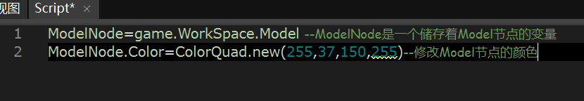 ModelNode.Color=ColorQuad.new(255,37,150,255)--修改Model节点的颜色我们在节点列表里创建一个script节点,将刚刚这段代码运行一下试试看。(前提是和我一样提前创建了一个Model节点)